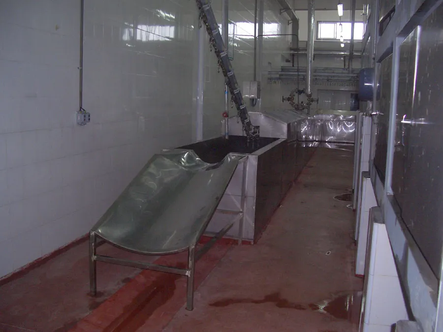運河式燙毛隧道采用豎式或橫式燙毛,由放血吊鏈懸挂豬體,用DJ-100Y型吊式放血浸燙輸送機牽引。